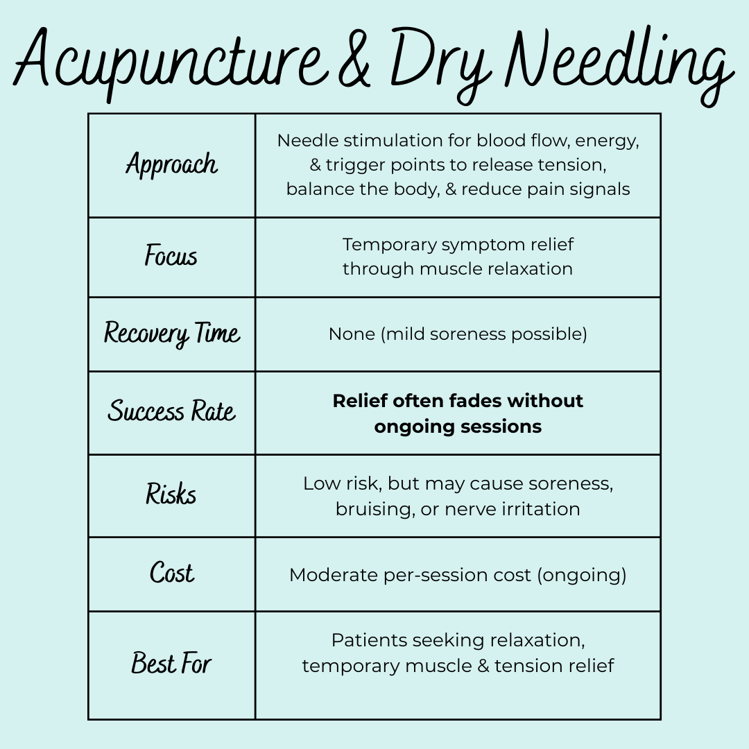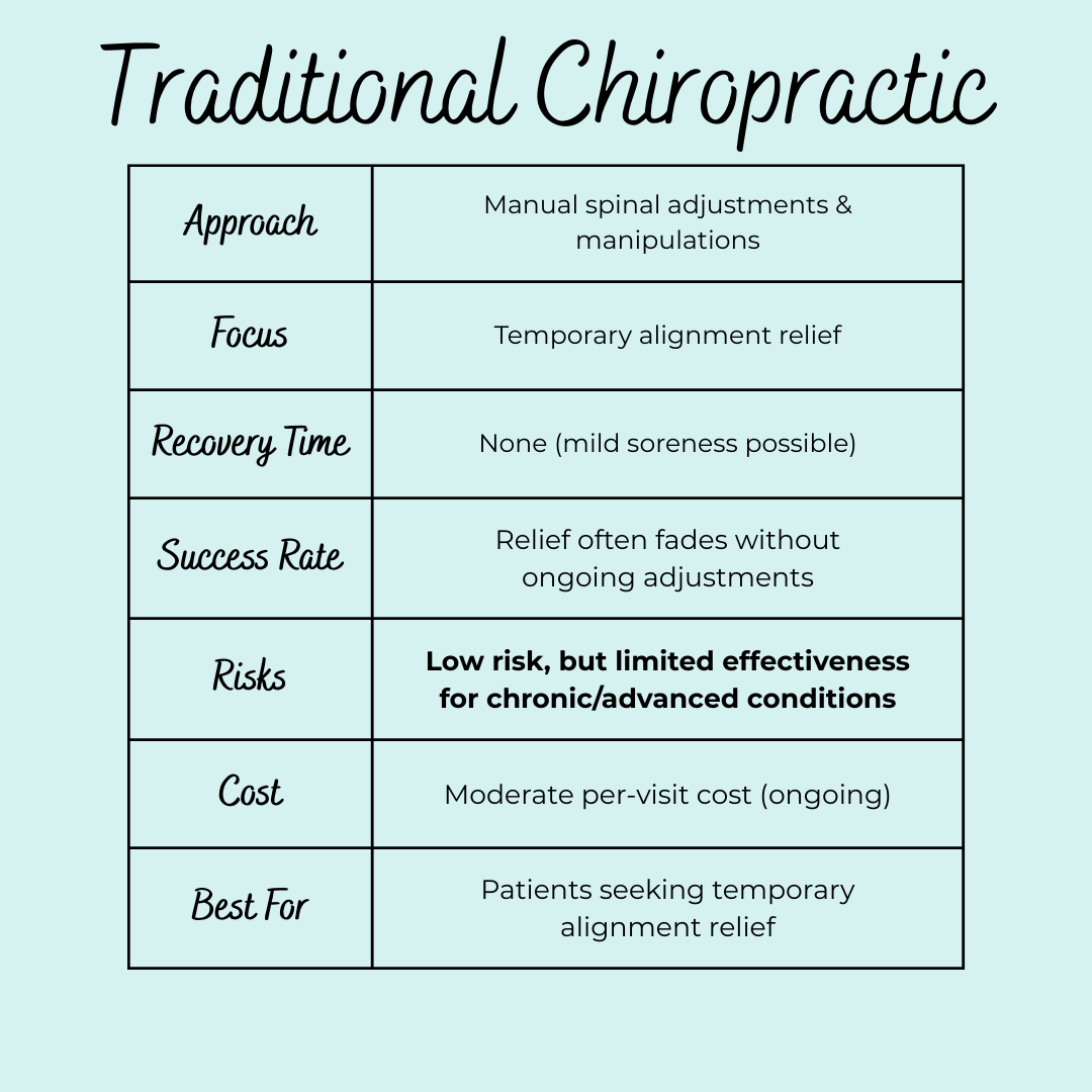 Unlike traditional chiropractic adjustments, basic acupuncture/dry needling, or invasive surgeries that require long, painful recoveries, our treatments are more comprehensive as well as non-invasive, with success rates of 86–90% long term!