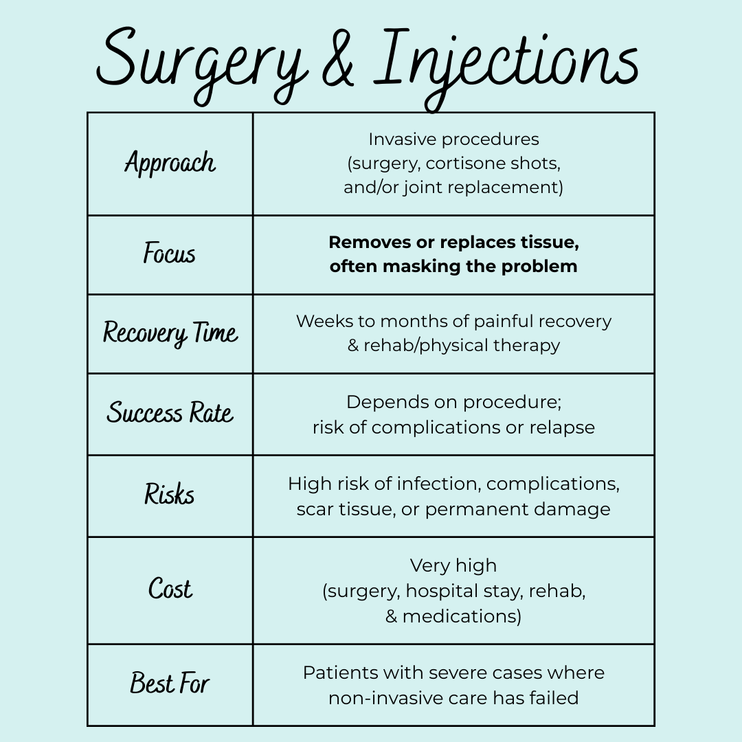 Explore the pros and cons of each below — and see how modern regenerative therapies combined with chiropractic & acupuncture at Advanced Being Clinic may be the smartest choice!